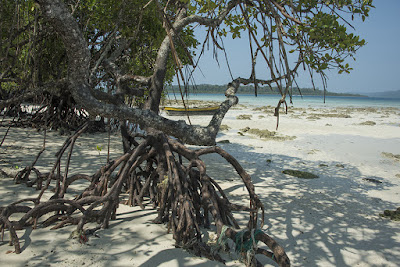 Ieri è stata una giornatina pesante, tra la notte in aeroporto, i due voli e la traghettata, ieri sera quando mi sono buttato nel letto, anche se dal bar della reception arrivava una musica a palla, mi sono addormentato come un ciocco. Pertanto oggi si presuppone tutta una classica giornata da spiaggia, asciugamano in spalla. Due passi e sei sulla sabbia; giriamo verso nord al contrario di ieri, non abbiamo neanche la voglia di prendere un tuktuk per andare in cerca della Elephant beach, che comunque pare sia piuttosto affollata. Qui, a Govindnagar beach, basta che cammini un po' e non c'è quasi più nessuno. Chissà dove si imbuca tutta quella massa di gente che sbarca dai traghetti? Va bene che è ancora bassa marea e l'onda arriva a poco a poco. L'acqua crescerà fino a mezzogiorno, credo, ma qui i turisti indiani, non amano più di tanto trascorrere il loro tempo sulla spiaggia, ci fanno un salto al massimo, si pucciano giù schiamazzando un po', poi vanno via quasi subito, se proprio vogliono esagerare si imboscano tra gli alberi con ceste di roba mangereccia a fare colazione. ogni tanto vedi in giro qualche coppietta che si fa i selfie romantici tra le palme, sembra infatti che l'isola sia molto gettonata per i viaggi di nozze nella middle class del subcontinente. Così devi soltanto trovarti uno spazio accogliente, tra gli alberi più bassi e fogliosi che garantiscono l'ombra migliore e soprattutto facendo attenzione a non avere cocchi a perpendicolo sopra la testa.