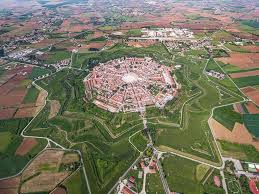 Qui si trattava di creare una città con caratteristiche di difesa squisitamente militare di cui la Serenissima necessitava assolutamente in quei tempi di guerre continue. Da qui nasce la meraviglia del progetto che secondo alcuni potrebbe addirittura nascere da un'idea di Leonardo, che non potè però essere della partita perché impegnato a Milano. La caratteristica particolare dell'insediamento è la cerchia di mura in cui è completamente racchiusa la città, che racconta di una perfezione geometrica e matematica unica al mondo. La sua perfezione è tale che che da qualcuno è stata definita semplicemente non umana. Solo dall'alto però puoi apprezzare la meravigliosa stella a nove punte della fortezza, coi nove bastioni, le tre porte diaccesso, le diciotto strade radiali di cui sei principali che portano alla piazza centrale, un esagono perfetto su cui si affacciano la cattedrale e gli altri edifici principali, tali da rendere confusi i visitatori che si trovano di fronte ad un panorama identico a 360°. Una numerologia che ruota attorno al numero tre, sulla quale la città è stata costruita. Per la verità ci furono forti difficoltà apopolarla, una volta che i lavori terminarono, non piacendo a nessuno di andarsi a stabilire in una città destinata per sua stessa formazione, alla guerra ed a subire chissa quanti futuri assedi e orde di conquistatori affamati e a quei tempi non si andava tanto per il sottile, si sa, la guerra è guerra, tanto che per popolarla Venezia dovette ricorrere ai forzati prigionieri della repubblica.
